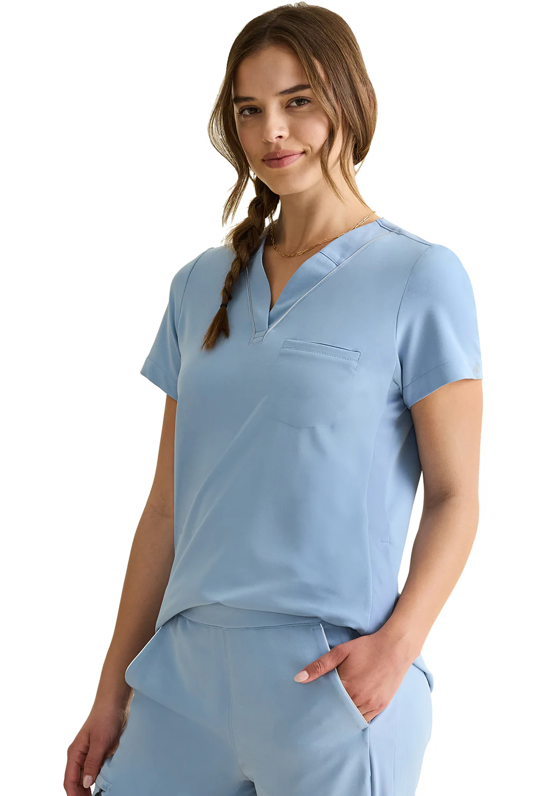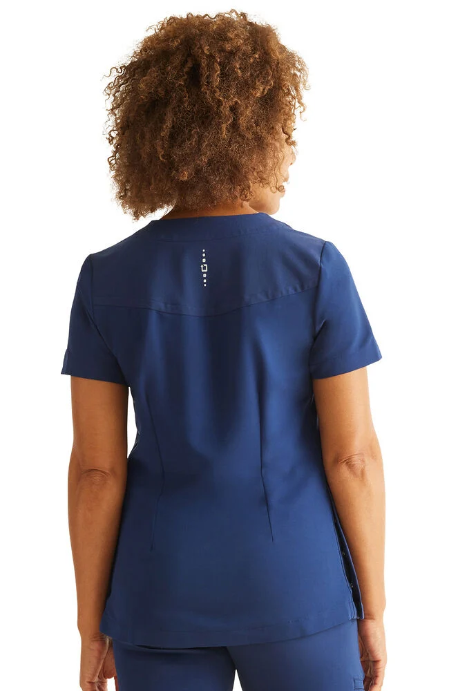This Modern Athletic fit top features a stylized v-shaped neckline with reflective trim. There is one welt chest pocket for storage and dyed-to-match knit trim on side panels with snap-closure side vents for mixed-media styling. A curved back yoke with dyed-to-match knit trim and back darts provide fit and shaping. Center back length: 25″